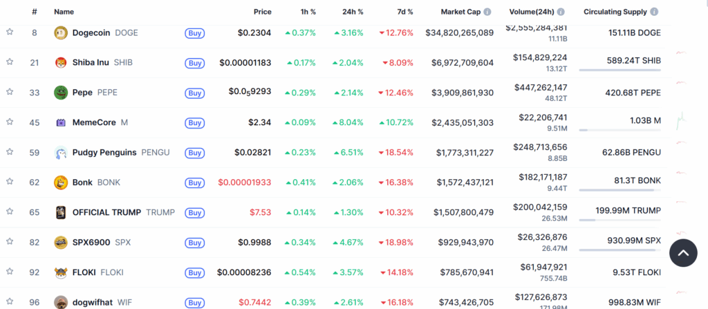 多数主流模因币在过去24小时实现显著涨幅。MemeCore(M)以8.04%的日涨幅和10.72%的周涨幅领跑,现报2.31美元,市值达24.3亿美元。PENGU紧随其后实现6.51%的日涨幅,当前报价0.02821美元,但其周线仍呈现18.54%的深幅回调。