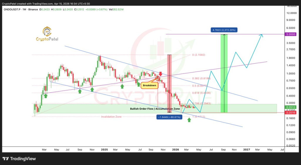 潜在上行场景需以阻力位上方结构确认为前提。若条件达成,Crypto Patel勾勒出价格首先上探1美元,随后重新测试2.15美元高点的路径。若市场强势阶段动能回归,进一步扩张或将推动ONDO价格突破5美元关口。