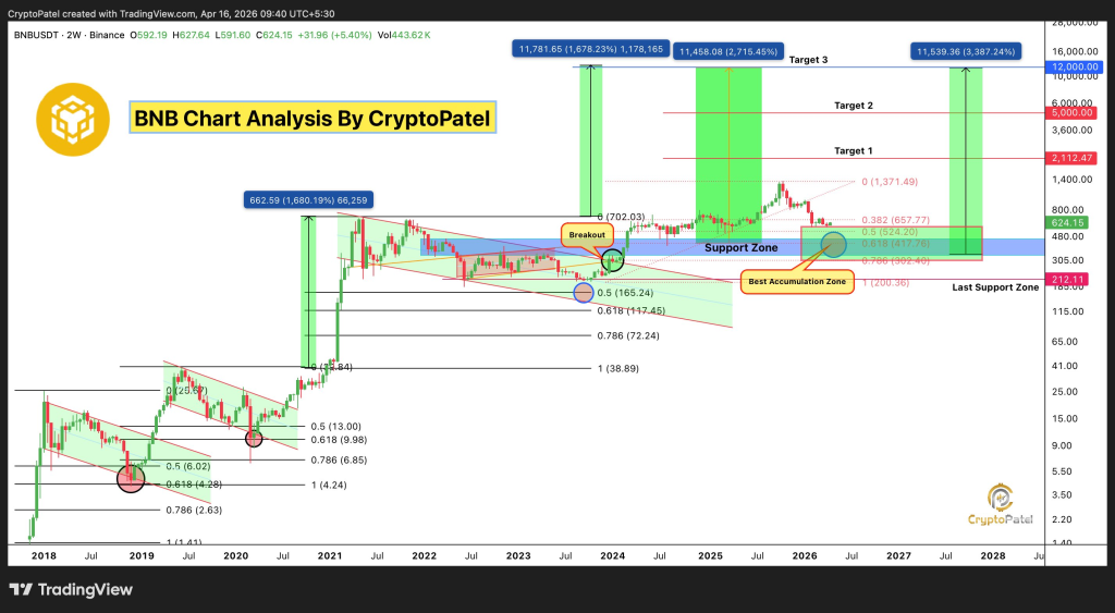 价格近期已升至该区域上方,目前正在测试更高水位。只要BNB能维持在该支撑带之上,整体结构便保持完好。根据过往周期表现,该区域被视作“最佳积累区间”。历史上每次回调至类似区域后,均在大幅上涨前创造了布局机会。虽然历史模式不能保证重演,但为理解市场行为提供了框架。