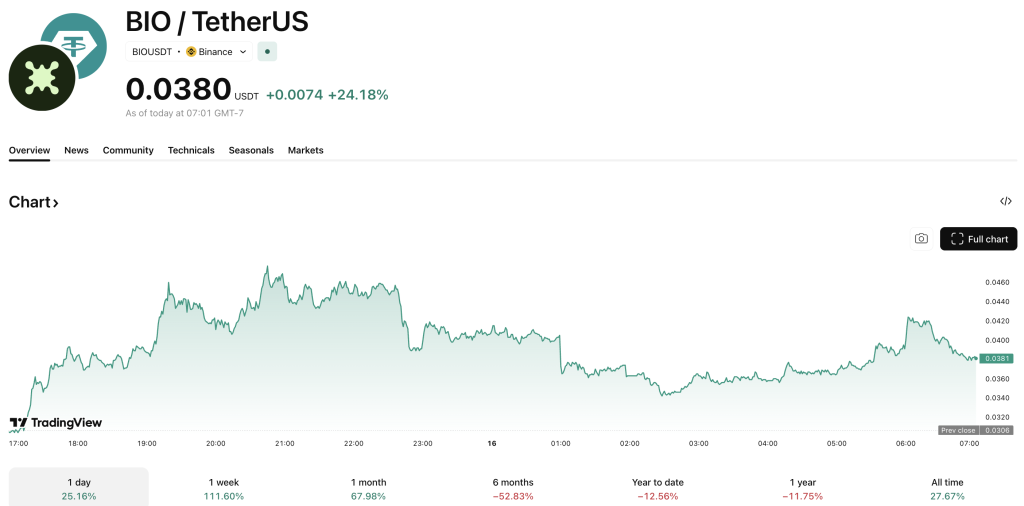BIO代币价格从4月13日的约0.018美元上涨至今日(4月16日)的0.038美元,涨幅达105%,交易量达到7.2亿美元,而其市值仅为6800万美元。