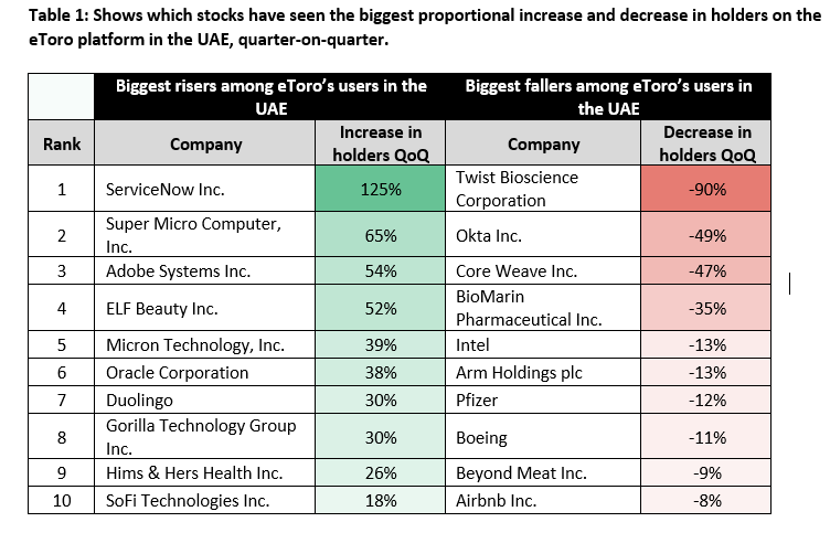 eToro市场分析师乔什·吉尔伯特向媒体表示,阿联酋投资者在第一季度对风险投向更为审慎,其行为主要由长期主题驱动,而非避险情绪主导。他指出最明显的信号体现在人工智能基础设施与软件领域,例如ServiceNow(+125%)、超微电脑(+65%)、Adobe(+54%)和甲骨文(+38%)均在市场压力下实现显著增持。