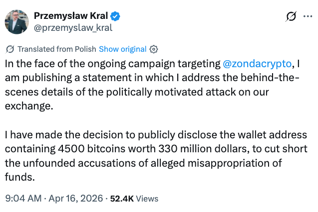 Kral公开钱包地址是Zonda在此次争议中首次进行此类披露。该地址目前持有4503枚比特币,价值约3.34亿美元。截至发稿时,记录显示的最后交易日期为2025年11月。