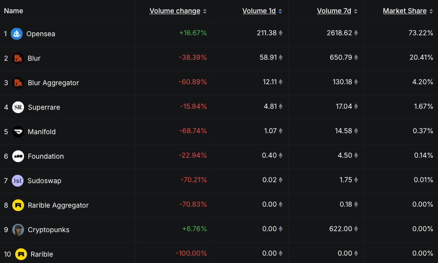 尽管行业整体下行,OpenSea仍然是主导的NFT市场,截至发稿时占据了该领域超过73%的活动份额,并面临来自Blur等竞争对手的挑战。