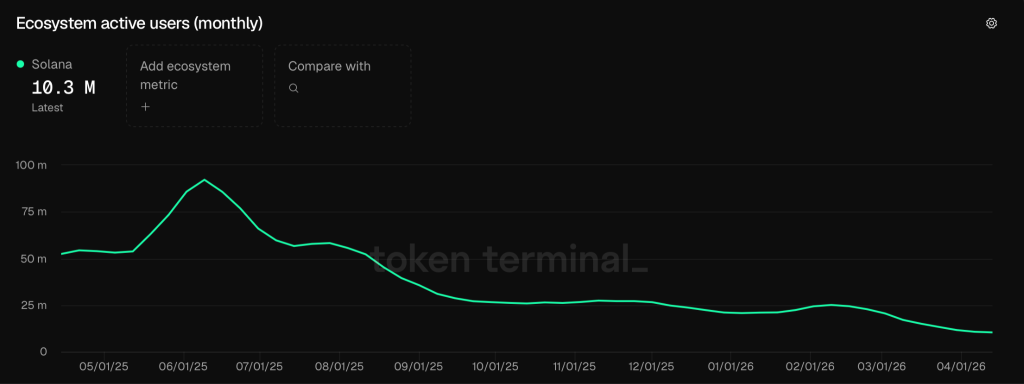 Solana的月活跃用户数已从峰值显著回落,从2025年中期的历史高位降至约1000万区间。这种持续下行趋势表明散户参与度正在减弱,链上活动减少,意味着该网络目前并未经历广泛性的用户增长。