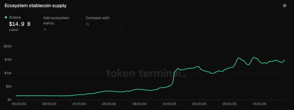 与此相反,Solana的稳定币供应量急剧扩张,已接近150亿美元,标志着生态系统内资本规模显著增长。这一增长表明流动性持续流入Solana,为交易、DeFi活动和短期投机提供了充足的“弹药储备”。