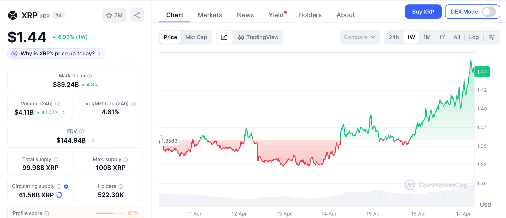 瑞波币价格现报1.44美元,教保人寿合作预示实际应用落地