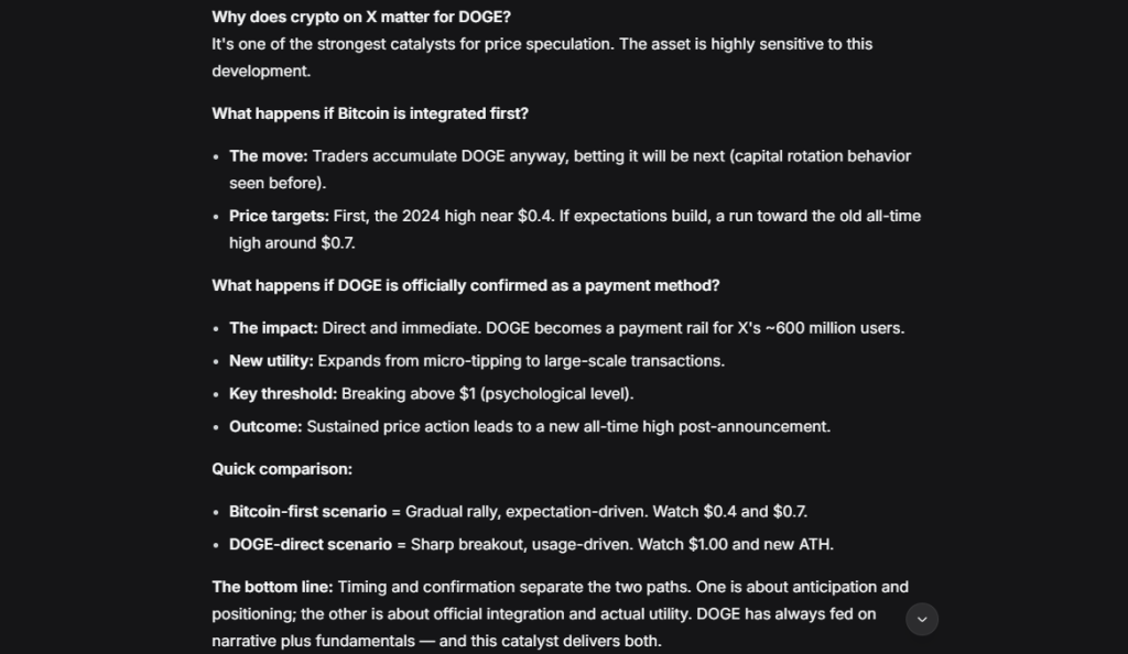 加密货币整合进X平台仍是DOGE价格投机的最强催化剂之一,当前情景突显了该资产对此进展的敏感程度。DeepSeek考量了所有这些因素,并对若X采用加密货币支付,DOGE价格可能发生的变化做出了一些预测。