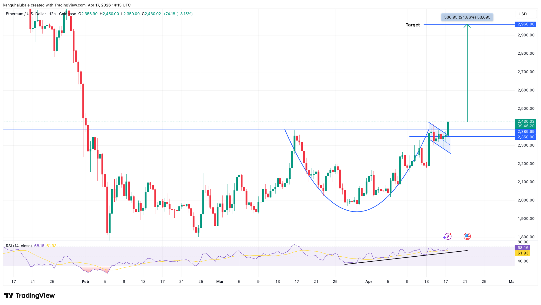 当前相对强弱指数(RSI)升至68水平,显示多头力量重新占据主导。分析师TheSkayeth指出,ETH在日线级别已构筑为期两个月的更大规模杯柄形态,并认为“即将启动大幅波动”。该形态的理论目标位约3,150美元,较现价存在30%潜在涨幅。