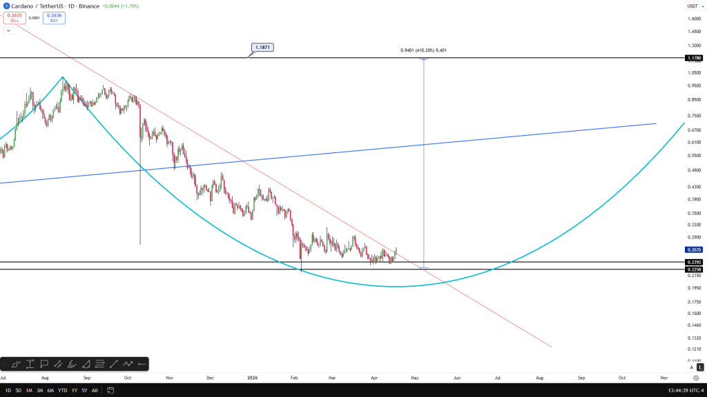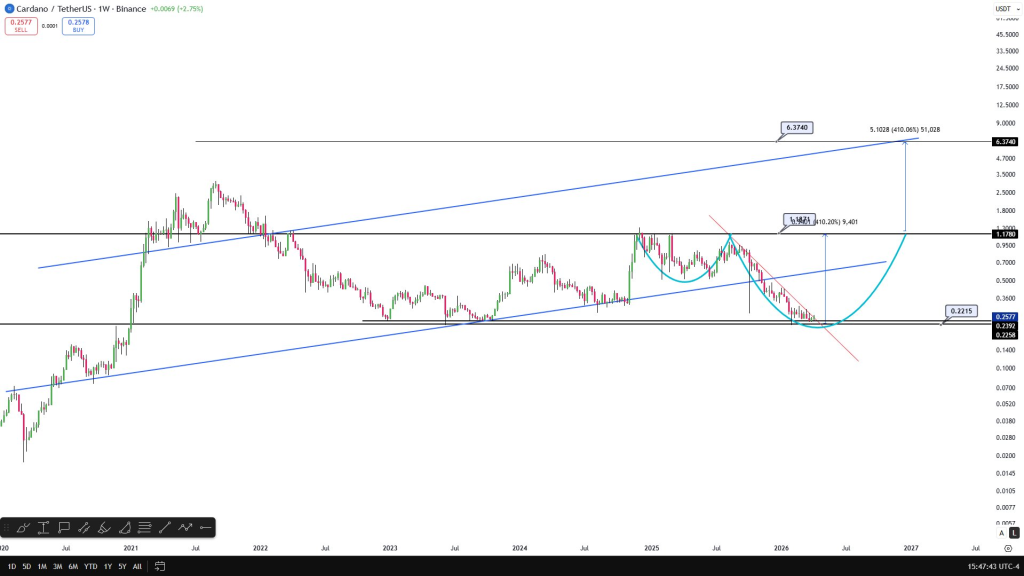 今日卡尔达诺(ADA)交易价格为0.26美元,日线图上小幅上涨。这与3.10美元的历史高点相去甚远。大多数投资者已将ADA视为可能永远无法复苏的落后者。但一位分析师持不同意见。他分享了两张图表——日线和周线——并称其中长期结构“堪称完美”。他对ADA牛市行情的目标价位是6.30美元。他表示,日线图上已出现突破。耐心将得到回报。