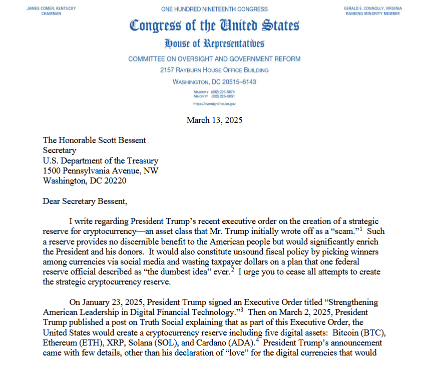 一位民主党议员要求美国财政部阻止特朗普政府创建战略加密货币储备的计划。弗吉尼亚州众议员杰拉尔德·E·康诺利向财政部长斯科特·贝森特发出信函,敦促其"停止所有尝试"创建该储备。