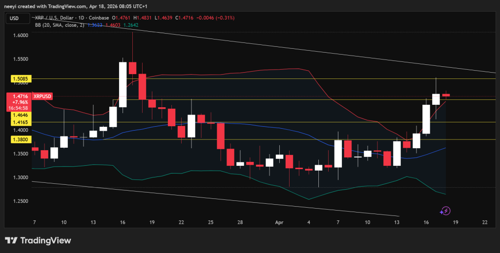 XRP价格已遵循其区间结构运行数周,目前正在测试该结构中最关键的水位。近期价格突破1.46美元后曾上探1.50美元,随后回落至1.47美元附近。