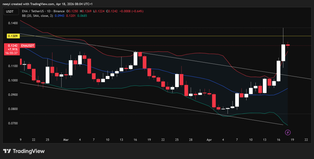 然而技术指标发出警示信号:相对强弱指数达70,显示ENA已处于超买状态;布林带呈现扩张态势,通常预示短期回调可能。