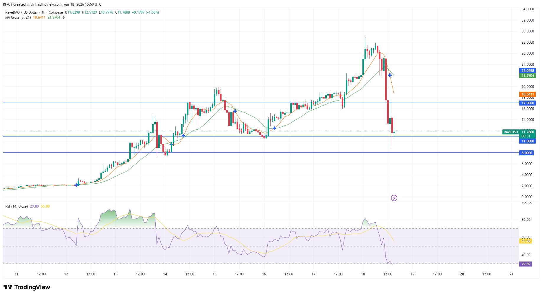RAVE在26-28美元区间见顶,垂直攀升后首次出现上涨乏力信号。随后市场试图维持结构,但真正的转折点出现在17美元——这个曾作为强力支撑的关键水平位。