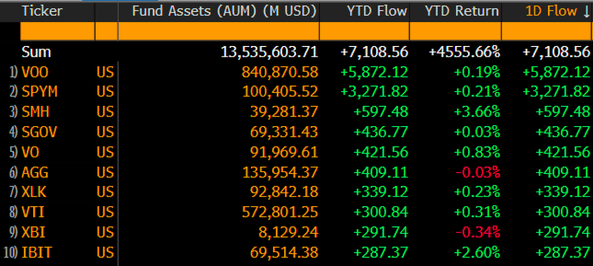 该表格按年初至今资金流对ETF进行排名,将先锋集团股票产品等行业ETF等传统巨头与新入局者进行对比。