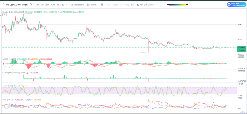 KAS现报0.03454美元,正处于支撑位上方。
