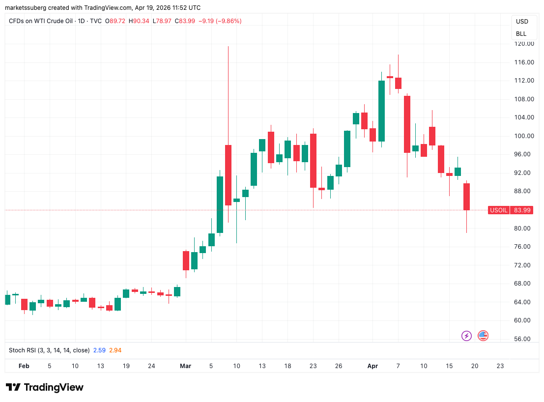 周末美伊双方释放的矛盾信号成为市场焦点,此前达成的停火协议与相互承诺似已瓦解。最新进展中,霍尔木兹海峡的再度关闭令当日焦点转向原油期货。停火消息曾使WTI原油价格自3月10日以来首次跌破每桶80美元。