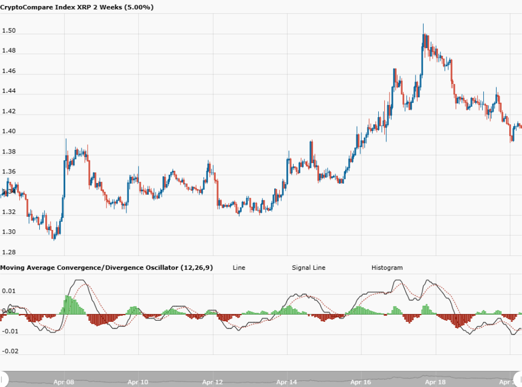附图显示了XRP从4月8日至4月18日的移动平均线收敛/发散指标。MACD线在1.30至1.35之间波动。信号线始终持平于1.00。直方图仅显示微小的负值读数,表明任何方向都几乎没有动能。