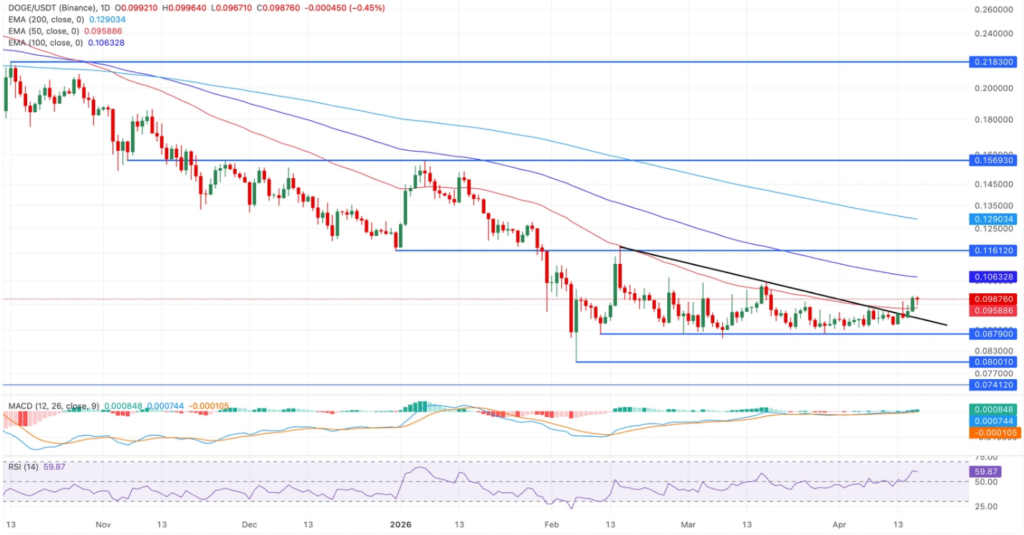 位于0.1063美元附近的100日指数移动平均线仍是关键阻力位,若成功突破可能推动狗狗币迈向0.11美元上方的更高复苏目标。