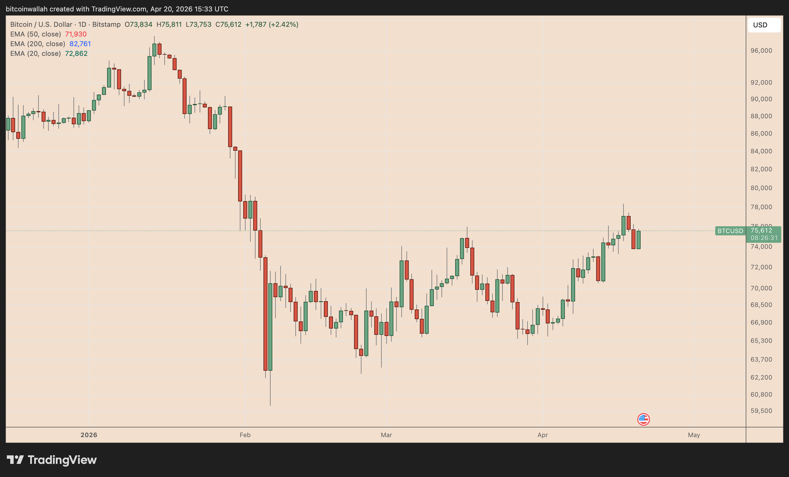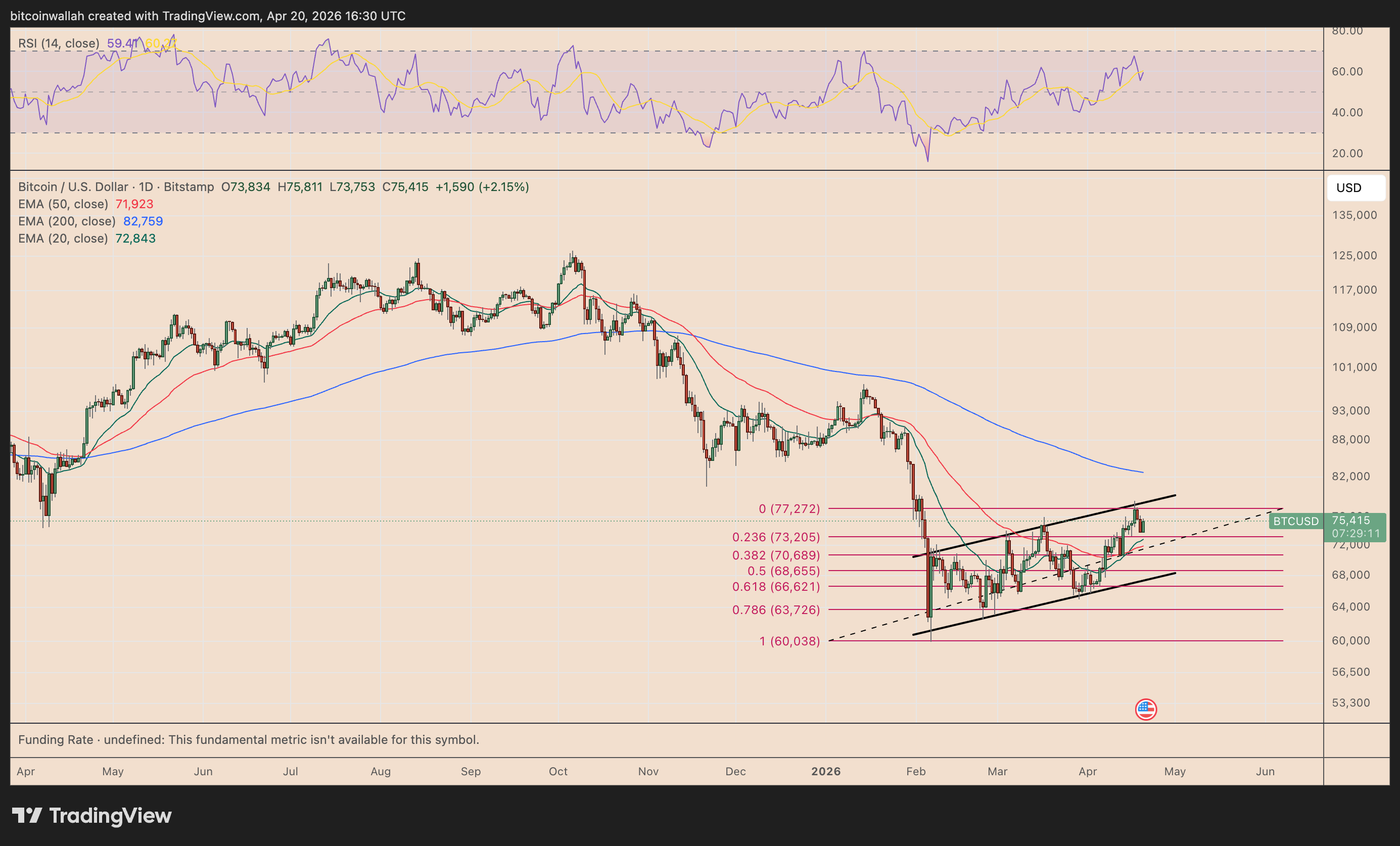 比特币目前的图表结构呈现典型的旗形整理形态,价格正漂向形态下沿。若支撑位失守,4月可能面临向67,000至69,000区域回调的风险。