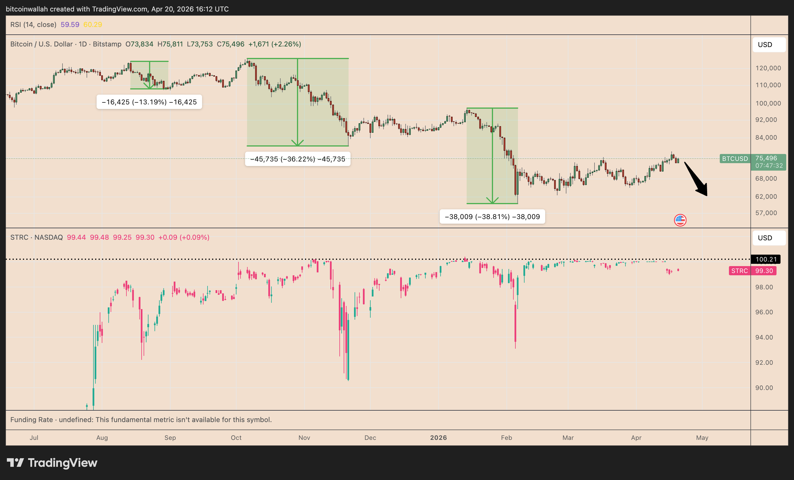 若从当前水平计算,30%的跌幅将使比特币价格跌至53,000美元。
