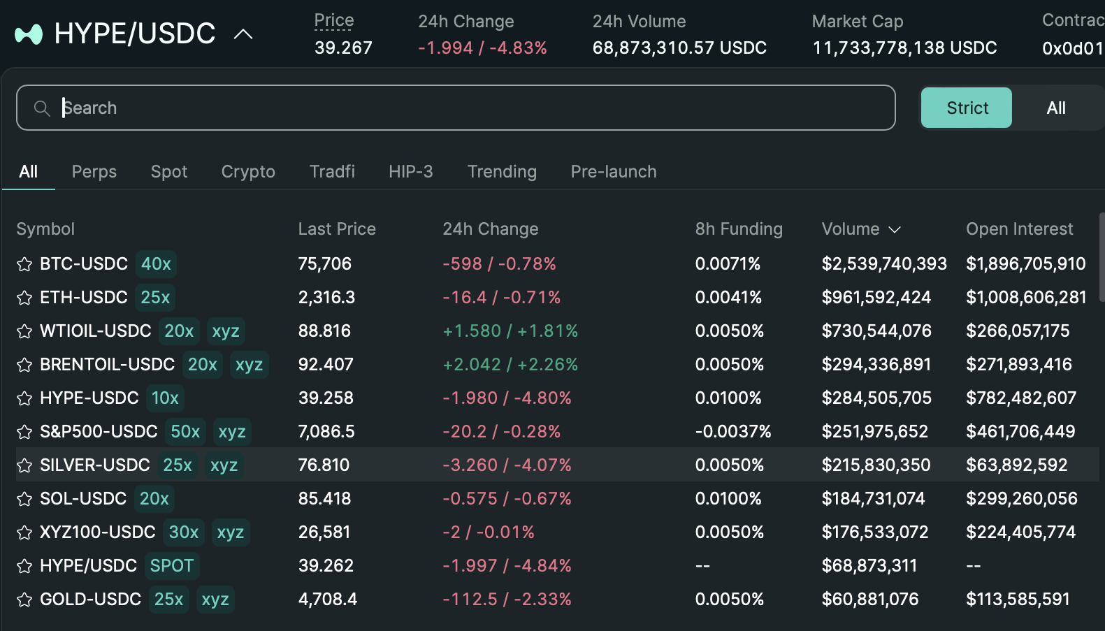 Hyperliquid平台同样实现了跨加密原生市场的扩展。平台数据显示,与大宗商品及指数挂钩的永续合约(包括原油、标普500指数和白银)已成为其交易量最活跃的市场之一,交易规模与比特币、以太坊等主要加密货币并驾齐驱。