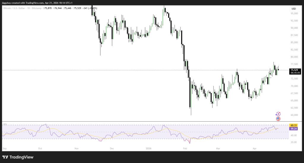 比特币目前交易价格约为75,529美元,其在2025年第四季度曾触及95,000美元附近的高点。从图表可见明显下跌趋势:每一轮峰值均低于前高,每一轮谷底亦持续下移。当前价格正悬于75,000美元支撑位上方。