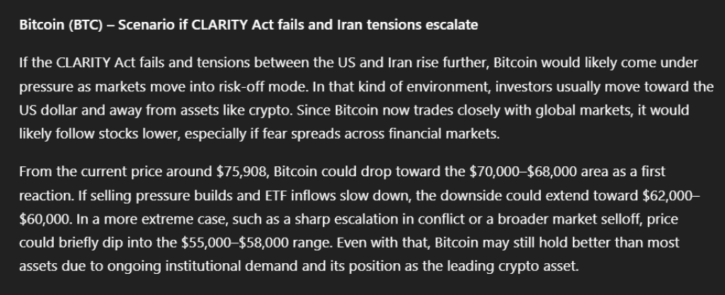 若《清晰法案》未能通过且美伊局势升级,投资者或将削减风险资产敞口,从而对比特币形成压力。在此环境下,资金通常流向美元,加密货币亦会随全球市场走低。