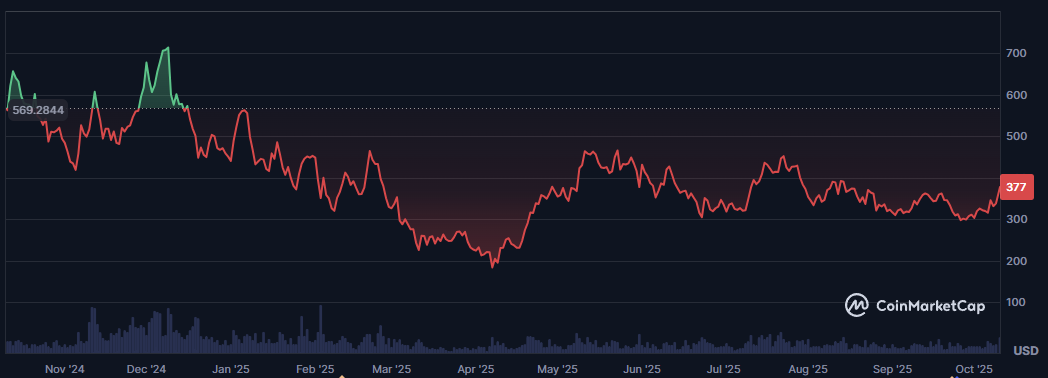 随着供应收紧和AI采用率上升,Bittensor可能在减半前后数月呈现强劲上涨势头。其768美元的历史高点约为当前水平的两倍,在这个牛市周期内实现该目标具有现实可能性。在AI概念代币中,TAO仍是最具技术可信度的项目之一。