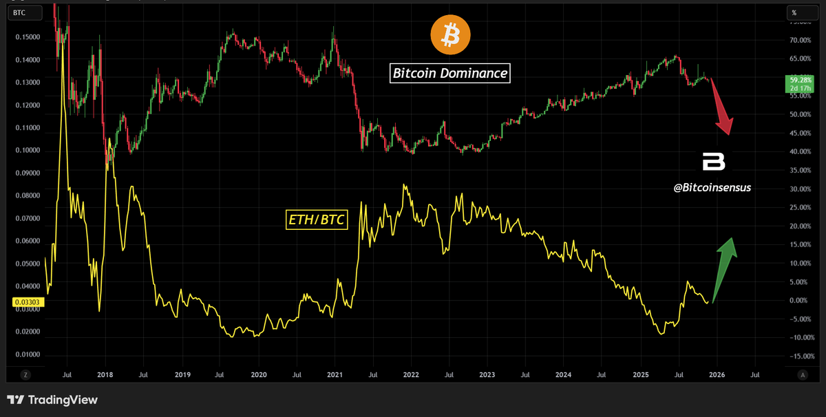 根据Bitcoinsensus发布的最新分析,其图表显示比特币市场份额出现决定性下滑,尽管整体市场价格走势仍显分化。从历史数据看,周期末段盘整期间出现的支配力减弱,往往预示着以太坊及高流动性山寨币将迎来更强劲的表现。