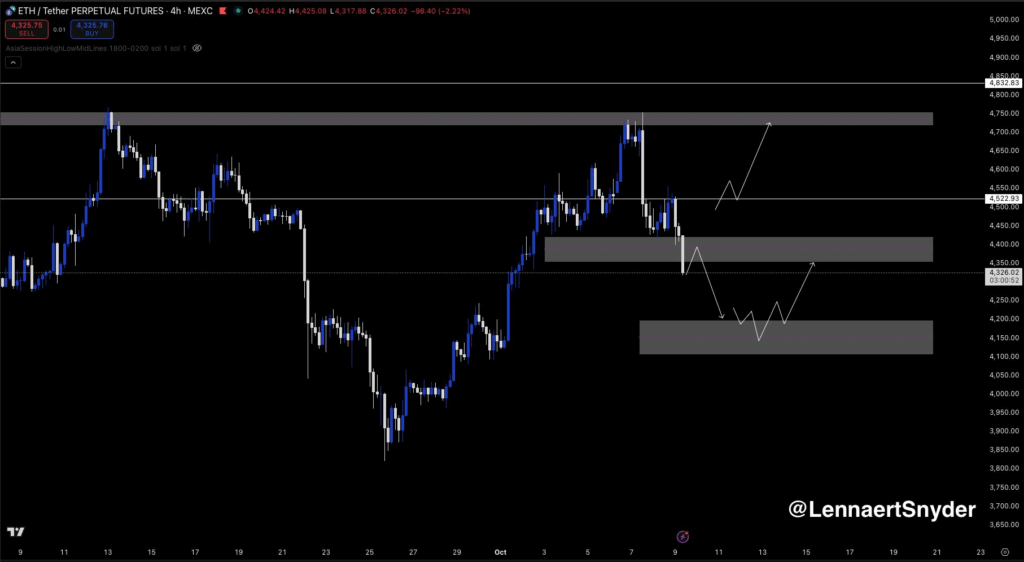 在以太坊价格下跌之际,分析师Lennaert Snyder表示,在持续抛压影响下,ETH价格可能滑落至4200美元。不过若能突破4400美元阻力位并转化为支撑位,则可能重启上涨动能。