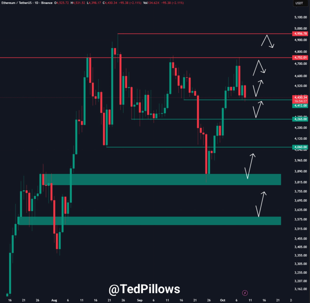 市场专家Ted持相似观点,认为这个市值排名第二的加密货币可能下探4250美元。其图表分析显示,若未能在此位置获得支撑,可能引发新一轮抛售至4000美元附近。