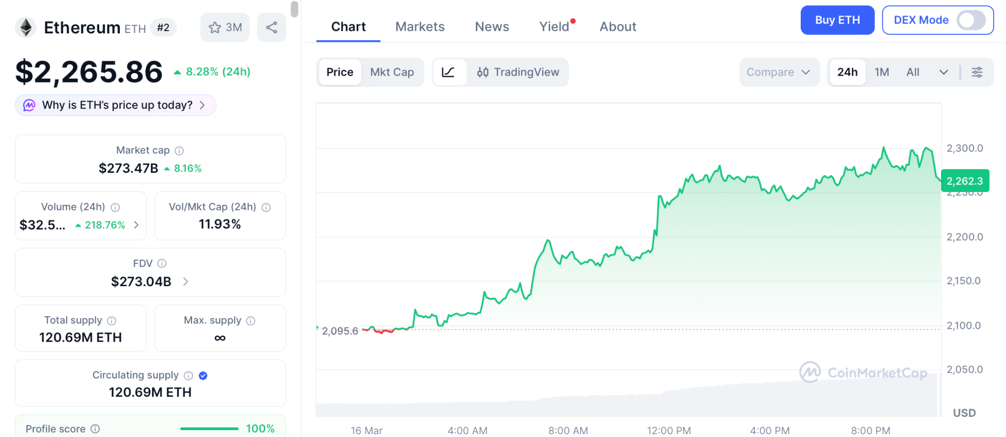 贝莱德推出的质押以太坊ETF首日交易额达1550万美元。许多分析师认为,该质押ETF可能在未来几周内吸引大量资金流入。根据数据,ETH交易价格为2265美元,日内涨幅8%。如果此轮涨势持续,以太坊价格预测近期目标为3000美元,下一个主要目标位为4000美元。