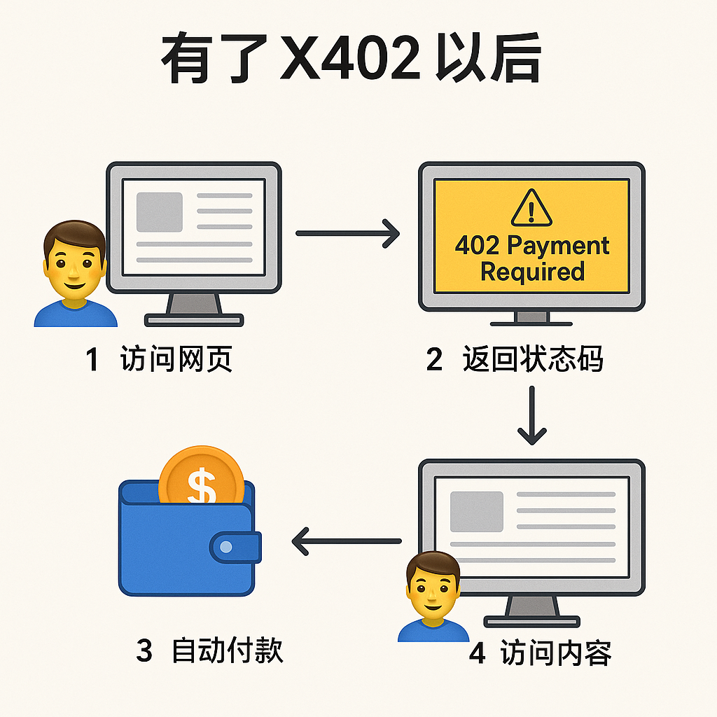 使用X402时:AI发出请求→服务器响应"需支付0.01 USDC"→AI即时支付→数据立即交付