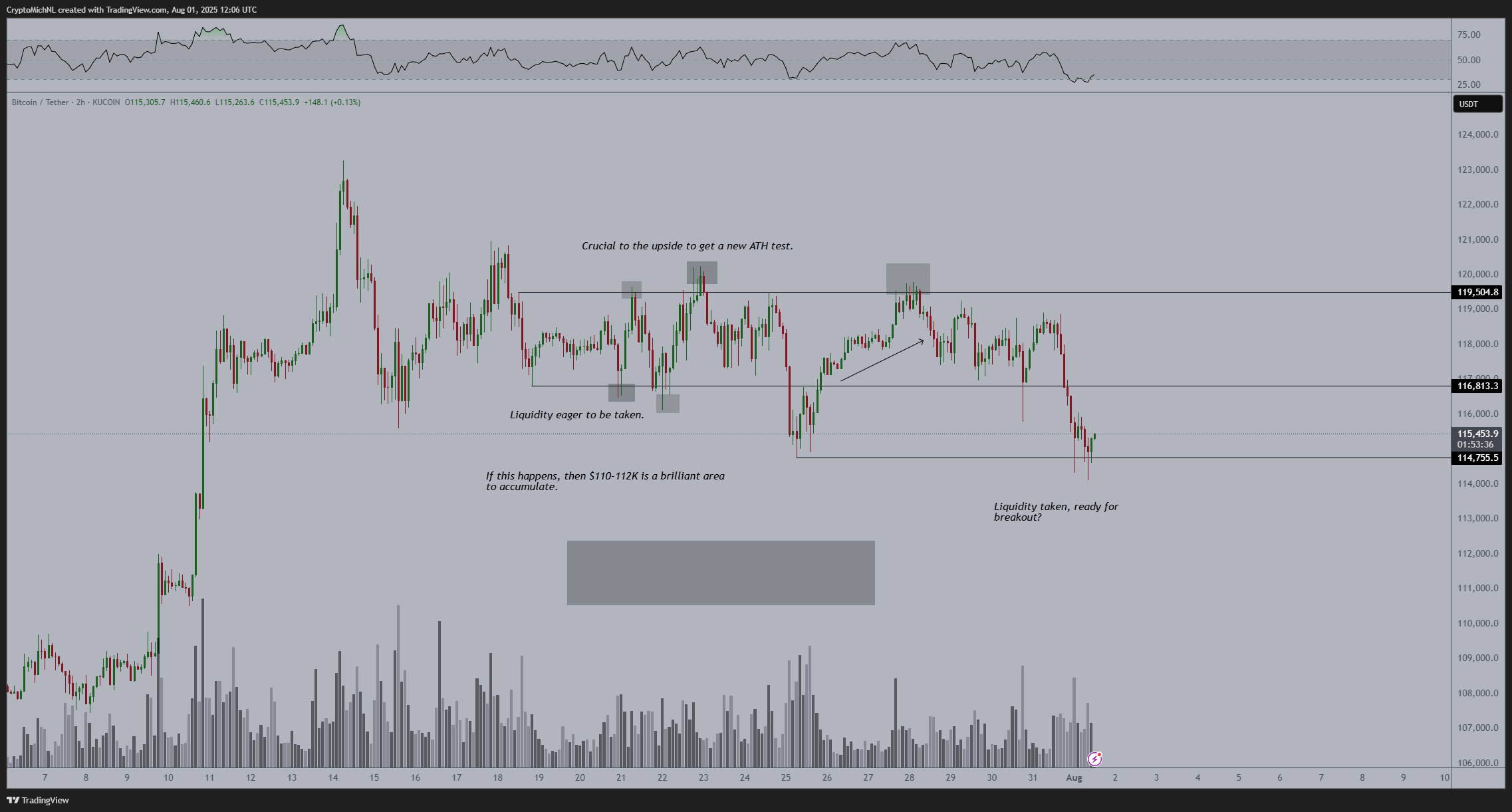 市场分析师Michaël van de Poppe指出,比特币已经清除了下行流动性,116,800美元区域成为关键测试位。他认为价格能否重新站上该区间将决定未来数周的走势基调,成功突破可能为创下新纪录高点铺平道路。