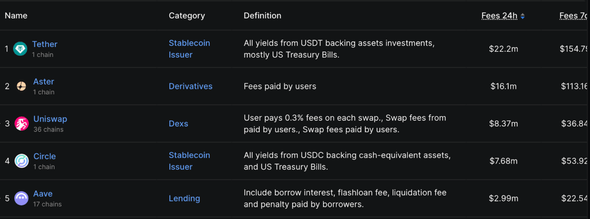 除集中交易外,Aster现已成为去中心化金融(DeFi)领域最大的手续费收入平台之一。