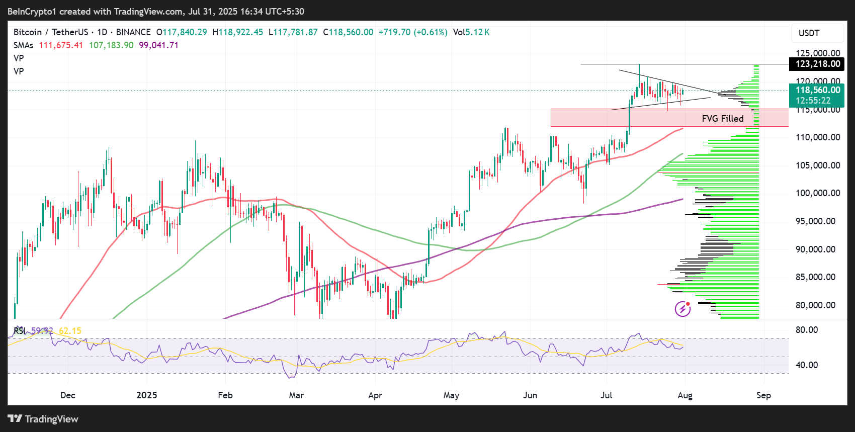反之若跌破旗形下轨,可能加剧抛压。但若守住112,060美元公允价值缺口(FVG)下沿或11,1673美元50日均线支撑,仍存反弹机会。值得注意的是,7月25日价格已回测该区域并填补FVG缺口。