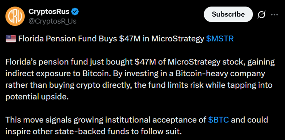 佛罗里达州养老基金投资MicroStrategy股票 | 来源:CryptosRus, X