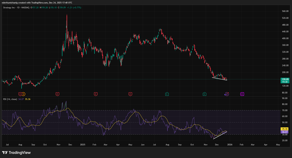 MSTR股价与其相对强弱指数(RSI)出现背离,暗示资金正在积累,潜在拐点可能临近。