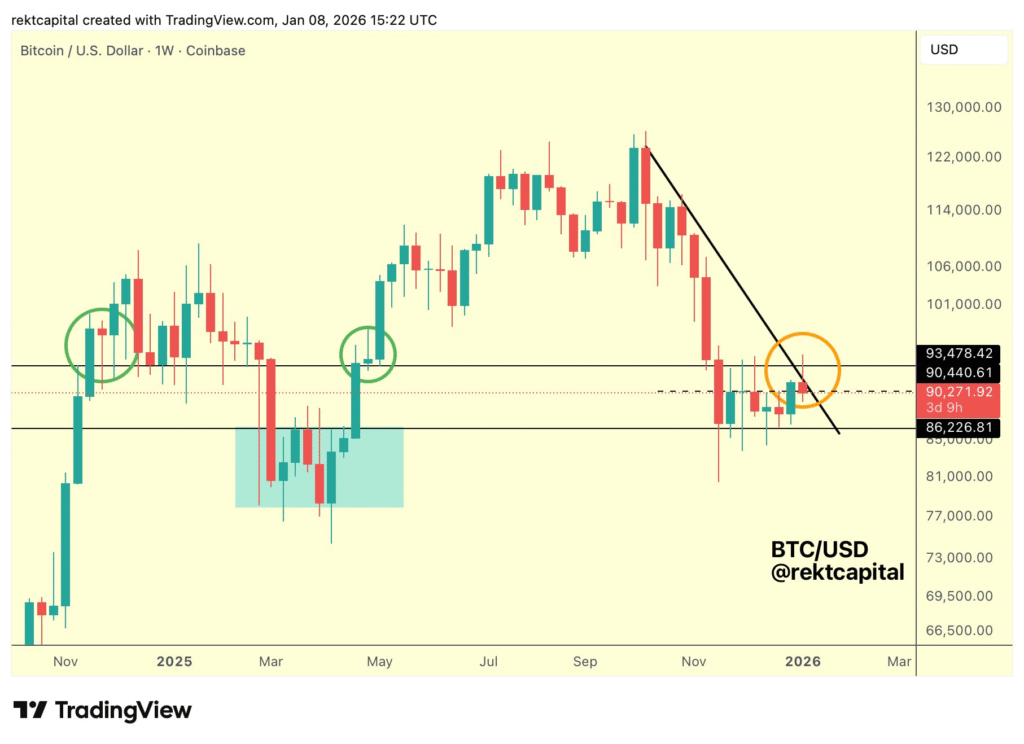 比特币近期未能突破93,500美元阻力位,这成为其价格走势的关键节点。分析师Rekt Capital指出,该阻力位与持续数周的下行趋势线重合,表明市场缺乏推动比特币上行的买压。