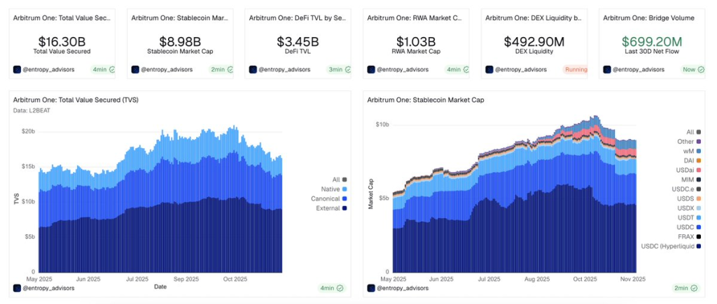 Arbitrum当前保障资产总价值达163亿美元,已从年初低点回升。网络活动再度升温,使其逐步接近2025年中创下的历史高点。