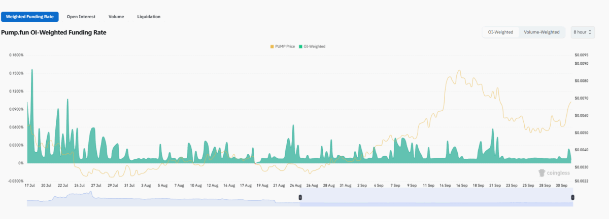 这显示PUMP当前价格上涨由真实买盘推动,而非高风险杠杆交易。自9月初以来,该代币已从0.004美元稳步攀升至0.008美元上方,虽经小幅回调,仍稳定在0.006美元关口之上。