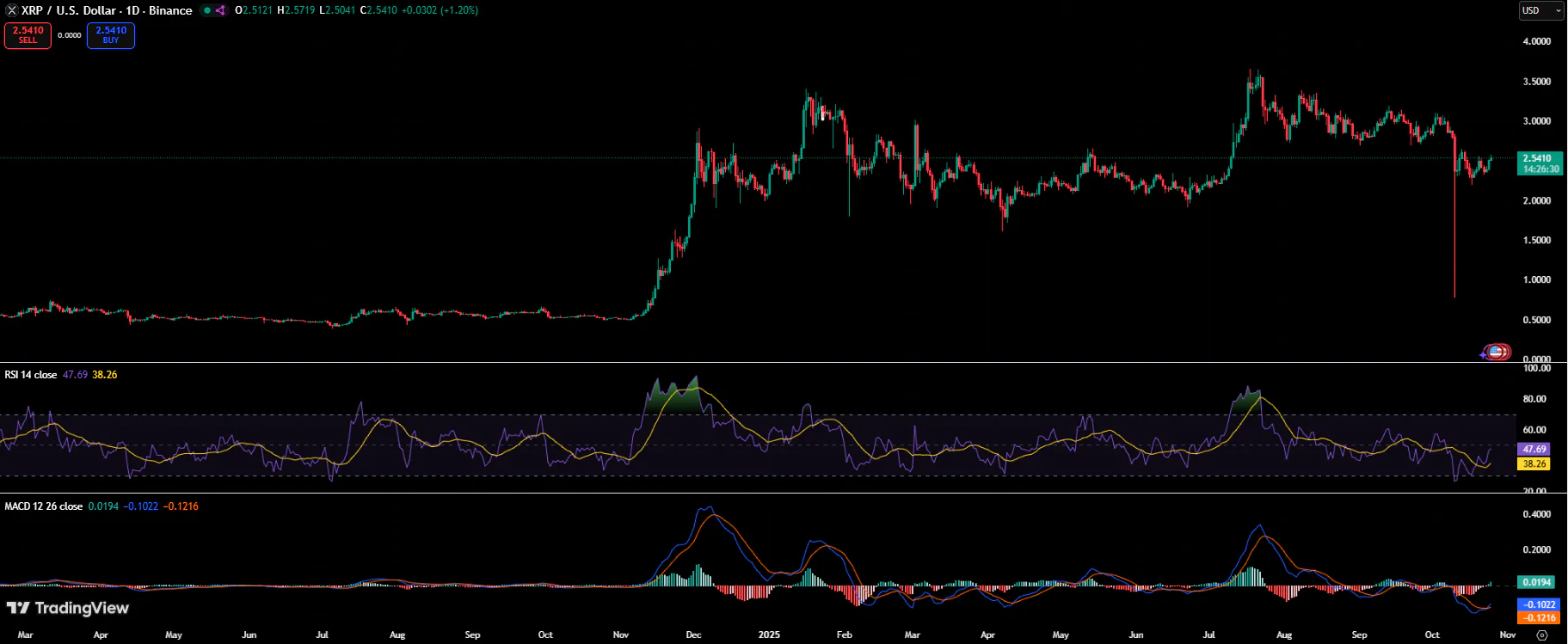 技术指标反映谨慎乐观态度。XRP的相对强弱指数(RSI)位于47附近,显示中性动能,而MACD柱状图已出现初步金叉迹象。这些信号配合逐渐放大的交易量,表明交易者正为潜在延续上涨行情布局。
