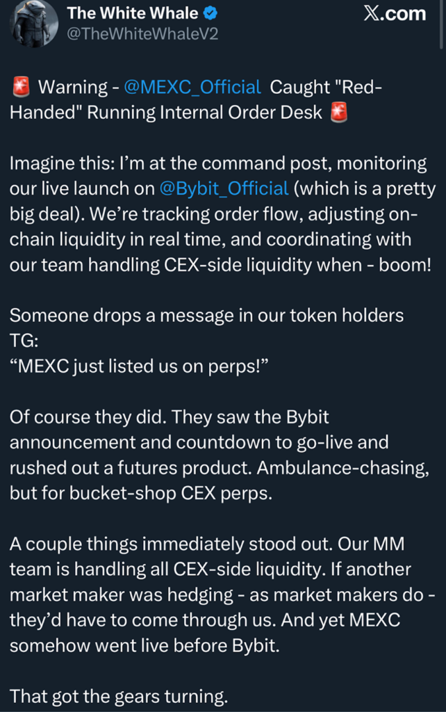 在Bybit公告发布后不久,白鲸提出了新的公开指控。他声称MEXC在官方做市支持尚未生效前,便将该代币上线了永续期货交易。