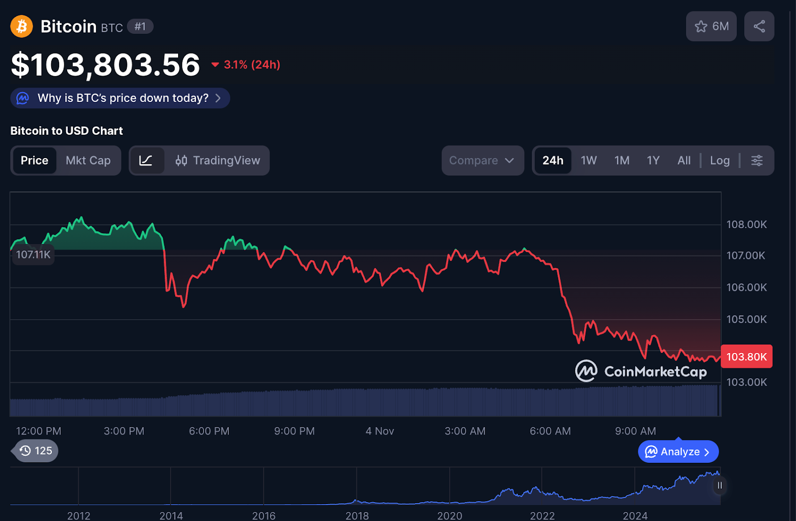 比特币跌至103,800美元,24小时跌幅3%,月累计下跌15%