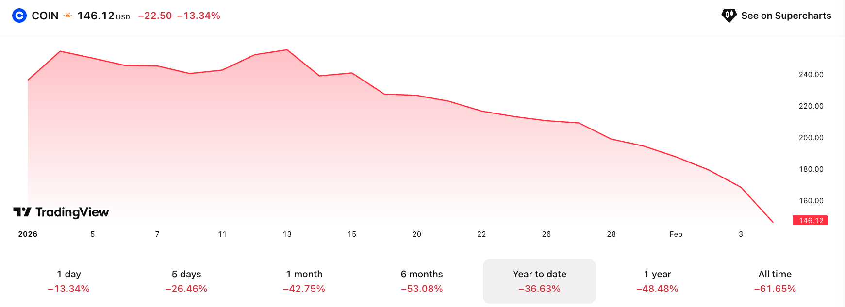 这标志着ARK在2026年首次出售Coinbase股票,也是自2025年8月以来的首次抛售,预示着其交易策略的转变。根据纳斯达克数据,这家加密货币交易所的股价年内跌幅已达约37%。
