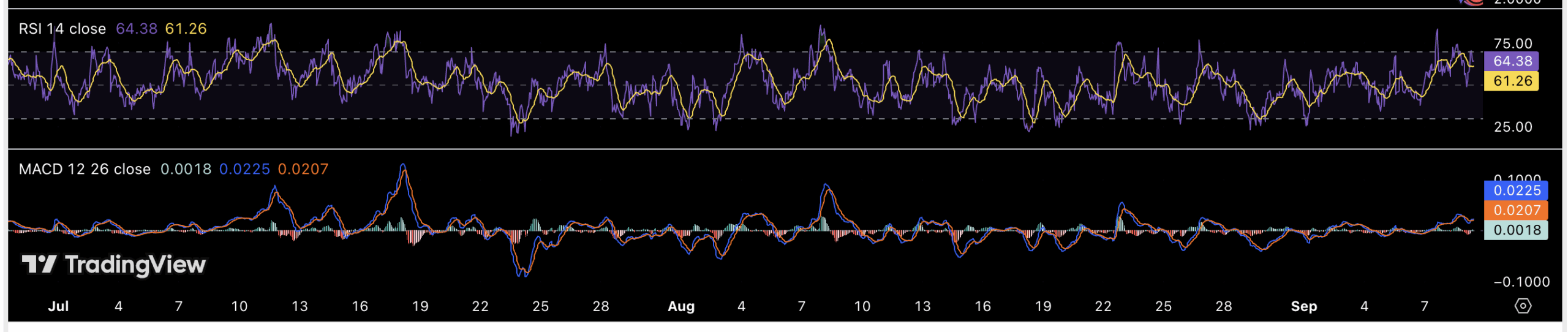 技术指标支持看涨观点:相对强弱指数(RSI)目前处于64附近,表明XRP虽具上涨动能但尚未进入超买区域,这为后续上涨预留了空间而不会立即面临大幅回调风险。