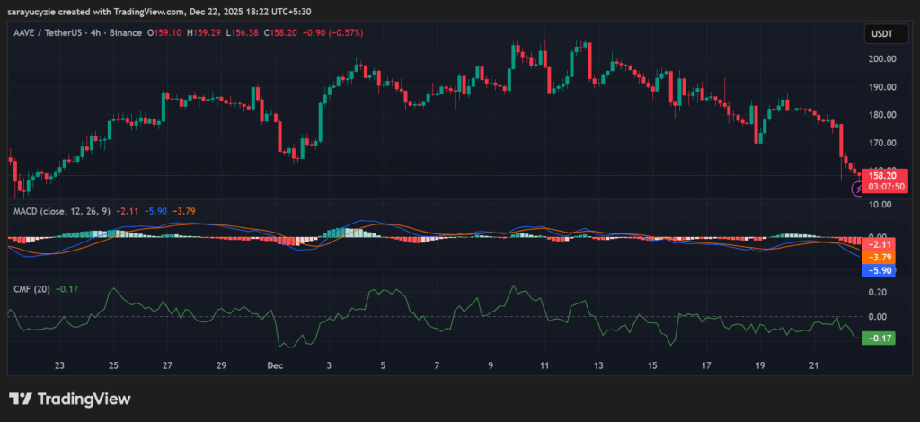 AAVE的MACD线与信号线均位于零轴下方,表明空头趋势强劲。短期走势落后于长期方向。值得注意的是,恰金资金流指标处于-0.17位置,暗示市场存在卖压,资金正持续流出。