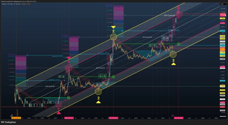 周线图显示狗狗币在0.19-0.20美元区间的走势与既往周期底部高度吻合。当前阻力位在0.34-0.35美元附近,若看涨形态持续,潜在上行目标可看至0.90美元。斐波那契扩展位显示长期高点可能在5-7美元区间,极端情况下反转周期动能或推动价格突破10美元。趋势线的精确性暗示机构认知和算法交易正在持续影响狗狗币市场。