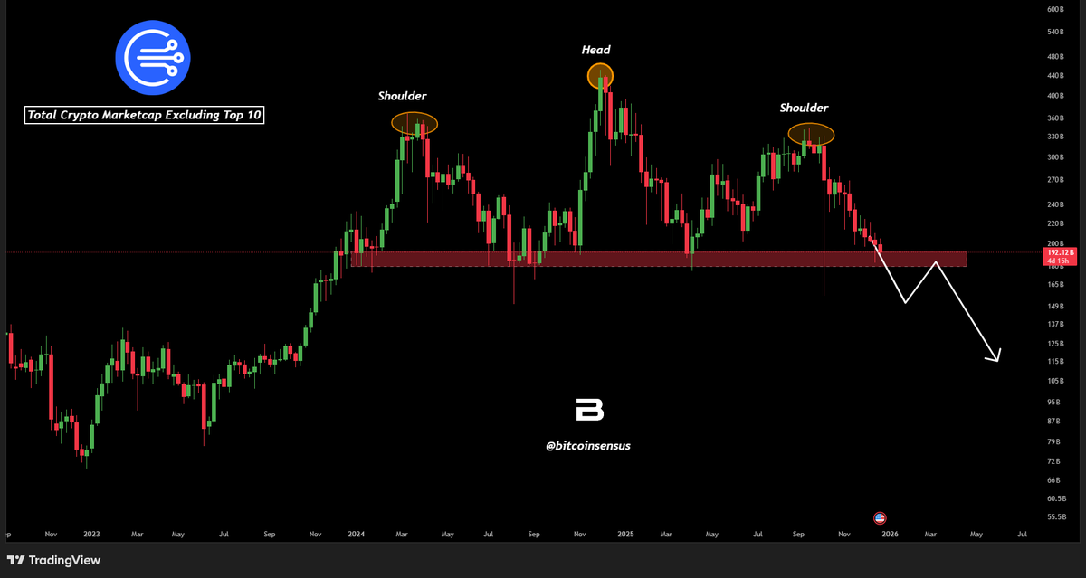 山寨币市场正在发出技术性警告,这一信号交易员通常不会轻易忽视。剔除市值前十名资产后的加密货币总市值图表显示出一个清晰的头肩顶形态,这种结构往往出现在重大趋势转折点附近。