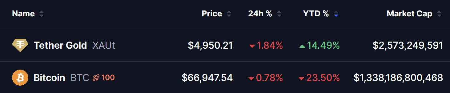 与此同时,由实物黄金1:1背书的代币化黄金Tether Gold交易价格亦徘徊在4,950美元附近,日内下跌约1.84%,但年初至今涨幅仍超过14%。而比特币则继续在六万五千美元中段区域徘徊,这凸显了黄金在2026年至今的相对强势。